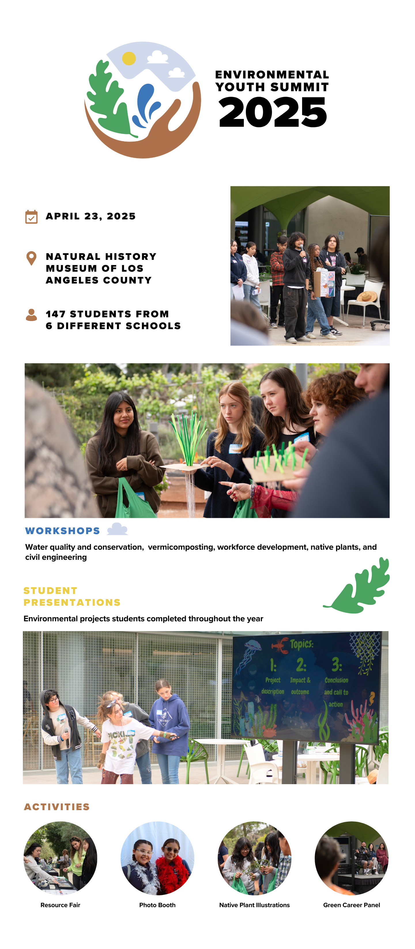 The Youth Summit brings together middle and high school students from throughout Los Angeles County to explore environmental challenges and youth-led solutions. It's an exciting and inspiring day of learning that includes workshops, a green career panel, speakers, student project highlights, and more.